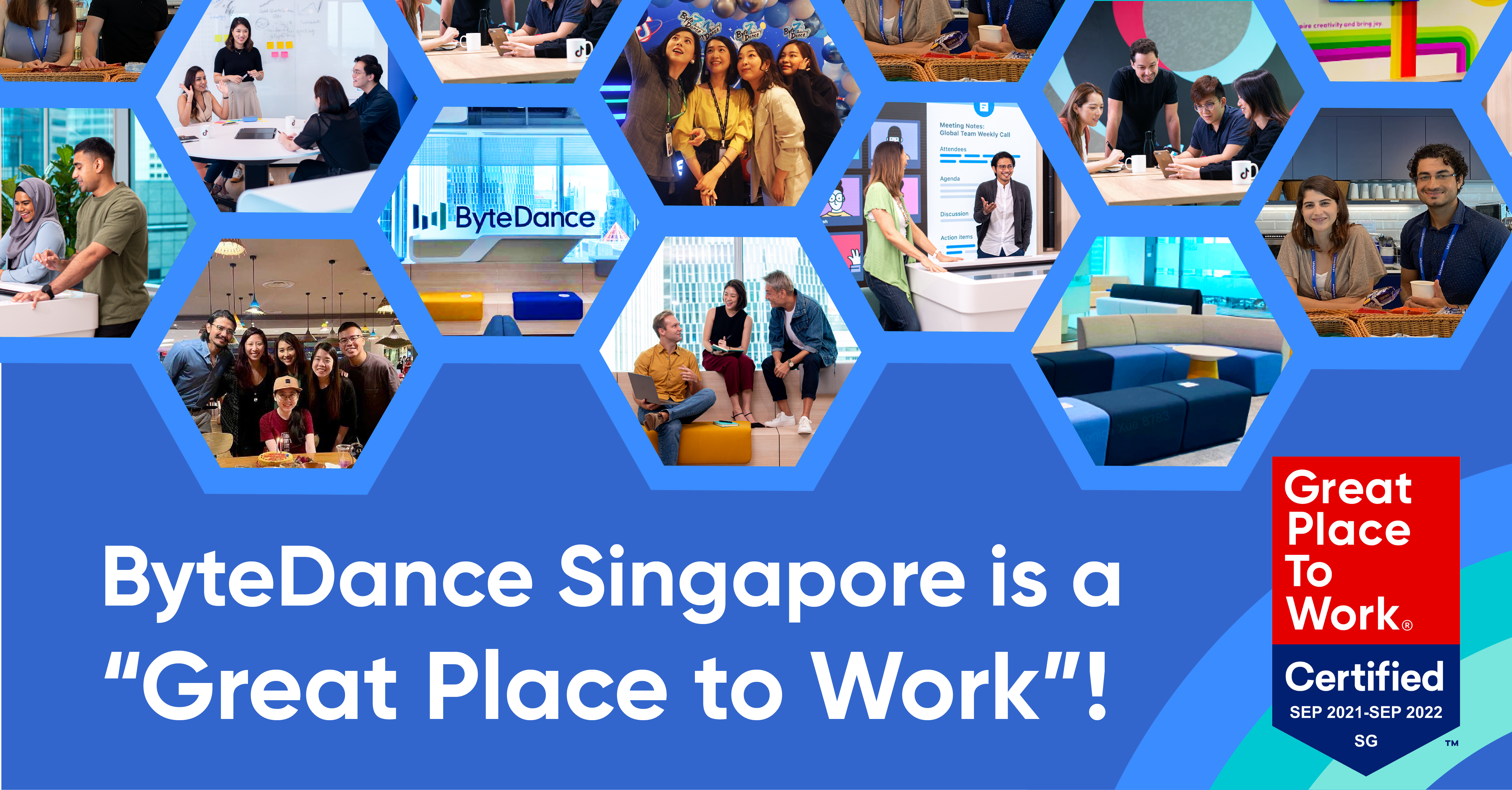 We're proud to announce that ByteDance Singapore has been certified by Great Place to Work®! This certification was awarded based on surveys of ByteDancers in Singapore that provided a comprehensive picture of the employee experience.